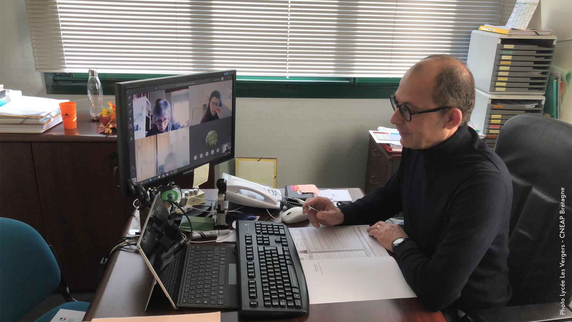 Les conseils de classe se déroulent eux aussi par visio. Ci-dessous, Philippe Pinot, directeur du lycée Les Vergers à Dol-De-Bretagne (35) et son équipe pédagogique.